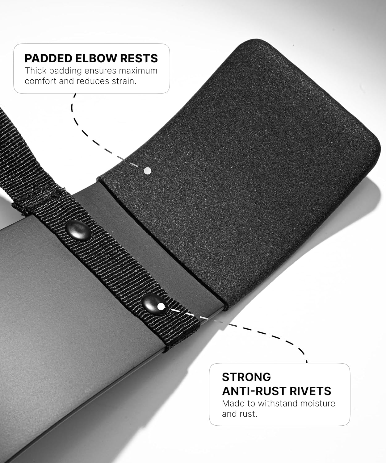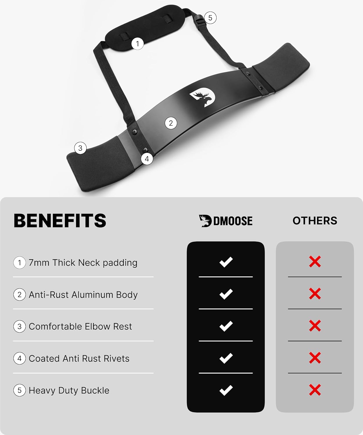 - 𝗣𝗥𝗘𝗠𝗜𝗨𝗠 𝗤𝗨𝗔𝗟𝗜𝗧𝗬 𝗙𝗢𝗥 𝗦𝗘𝗥𝗜𝗢𝗨𝗦 𝗥𝗘𝗦𝗨𝗟𝗧𝗦: Engineered with high-strength aluminum construction and unbreakable rivets, the DMoose Arm Blaster and Bicep Curl Support Isolator is built to withstand even the most intense workouts. The heavy-duty buckle and premium nylon strap ensure a secure fit and lasting durability, while the comfortable elbow and neck padding provide unparalleled comfort during your training sessions.