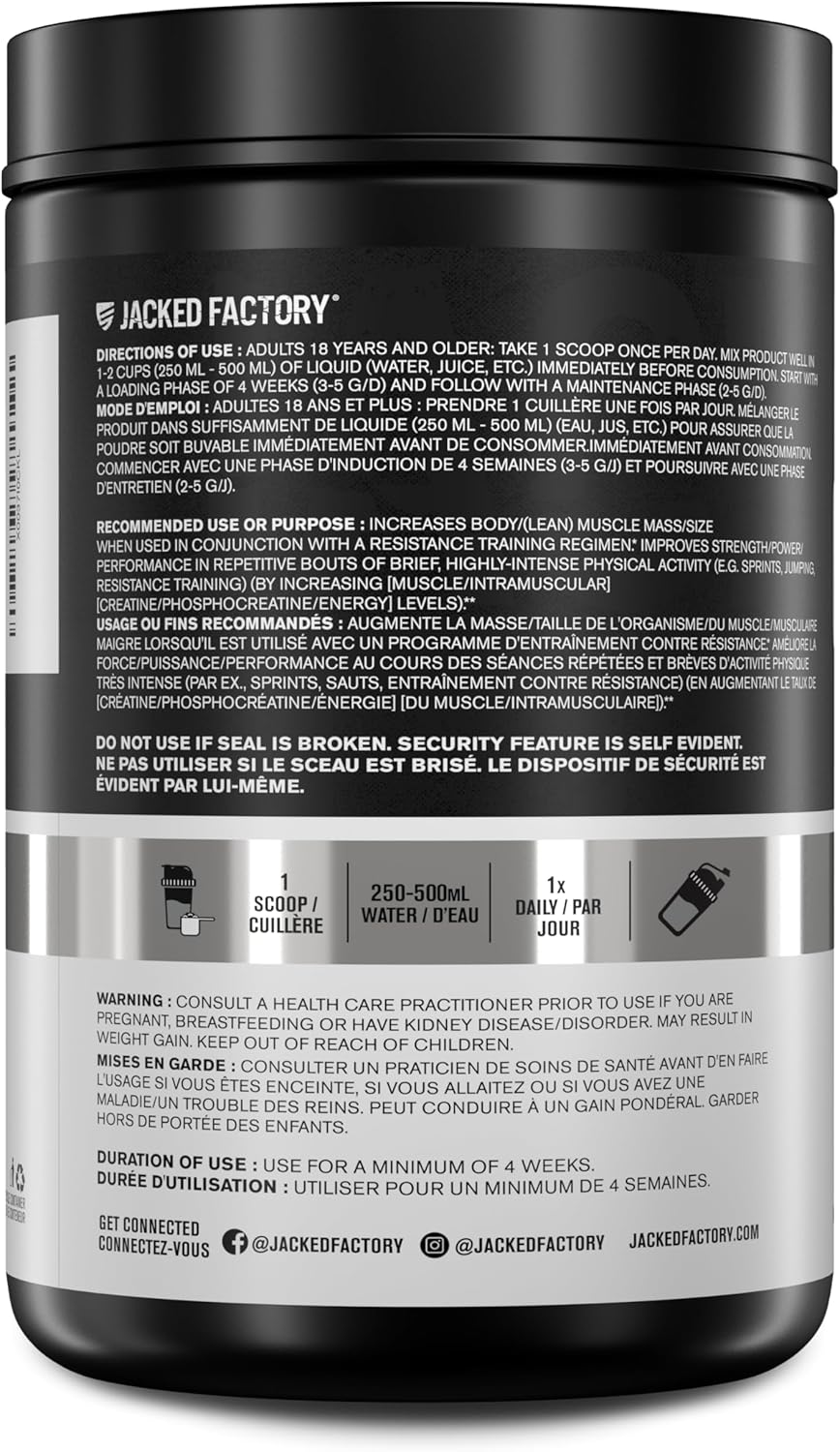 - Pure Creatine Monohydrate Powder: Jacked Factory Creatine Monohydrate powder features 5000mg of pure creatine monohydrate in every scoop. Our creatine powder mixes easily in any drink of your choice or it can be mixed with your favorite supplements such as pre-workout, protein, and BCAAs.