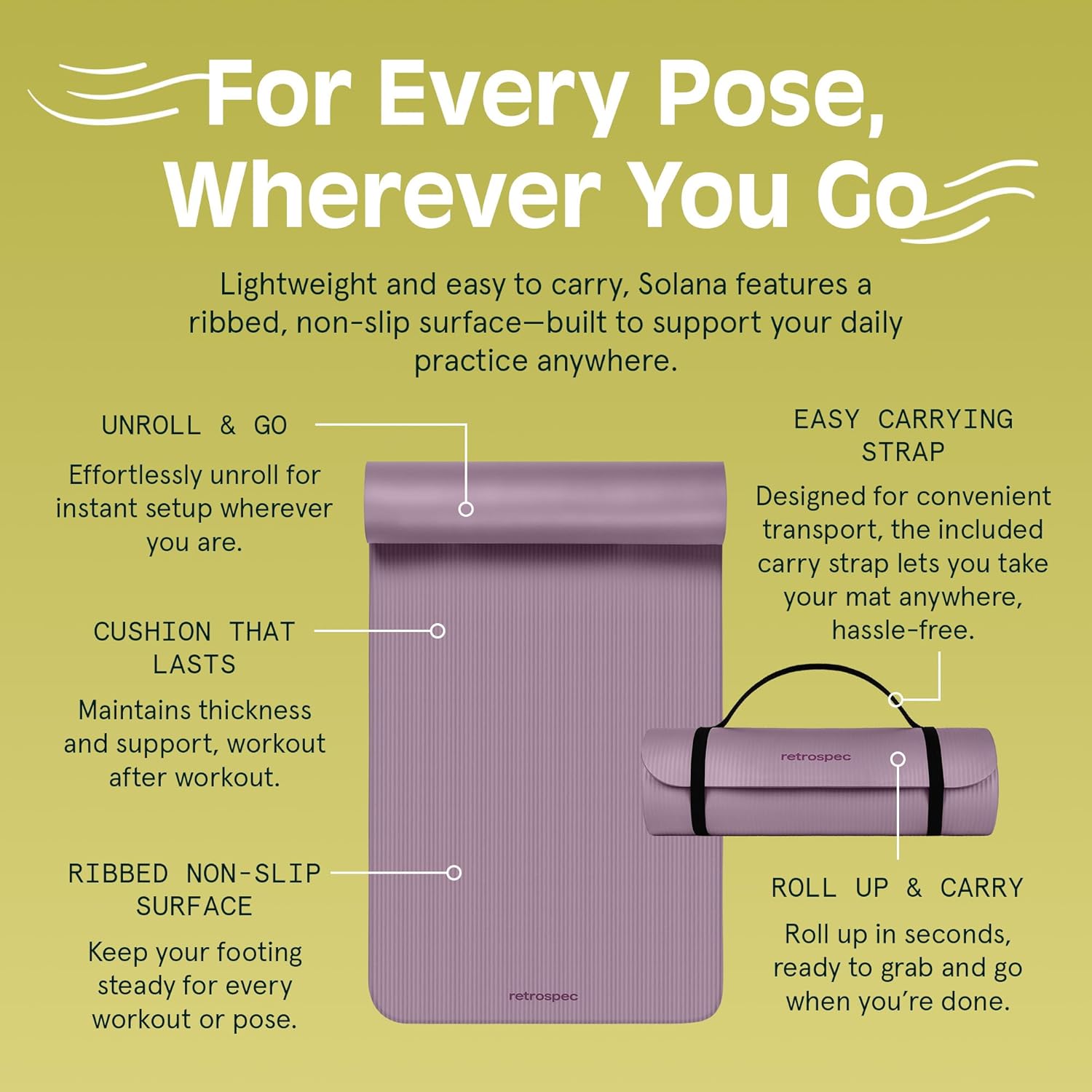 - DURABLE & PORTABLE: Solana’s thick, durable material allows for everyday use, regardless of the intensity of your exercise. Solana comes equipped with a nylon carrying strap so you can easily transport it from your home practice to studio salutations.